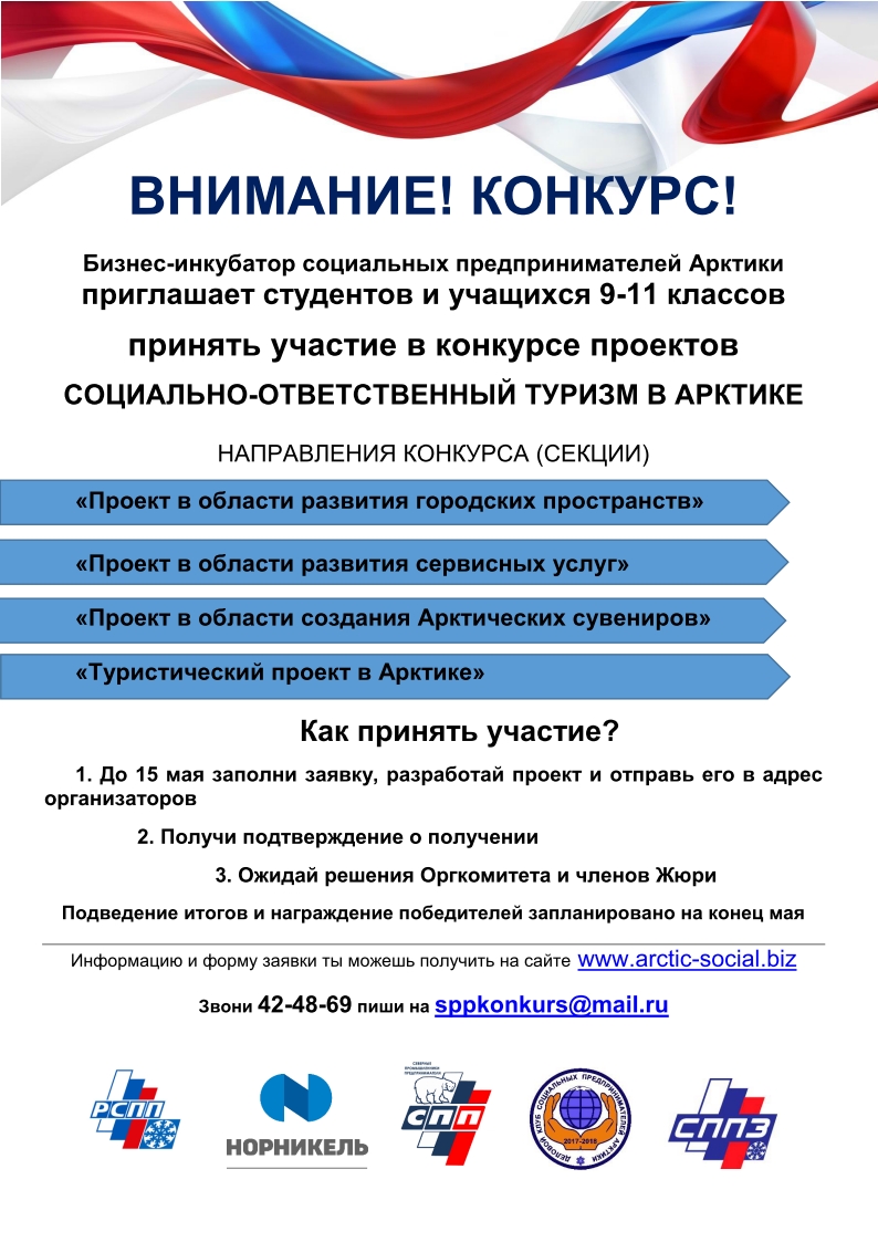 Союзы работодателей Арктической зоны Красноярского края при поддержке ЗФ ПАО «ГМК «Норильский никель», Управления образования Администрации г. Норильска и Координационного совета РСПП по развитию Северных территорий и Арктики объявляют о старте конкурса проектов социального предпринимательства в туризме среди учащихся 9-11 классов средних общеобразовательных школ и студентов ВУЗов Арктической зоны Красноярского края «Социально-ответственный туризм в Арктике».